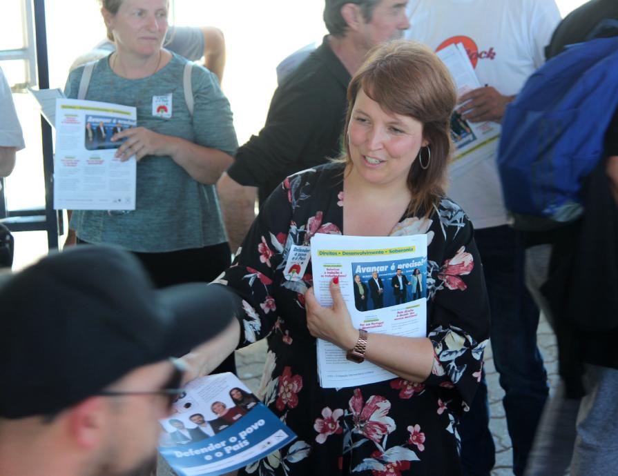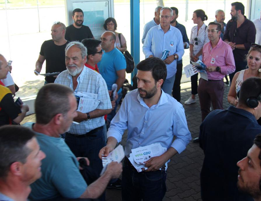 Depois das acções no Montijo e Palmela, João Ferreira e Mariana Silva, candidatos da CDU, rumaram para a entrada principal da Autoeuropa. À porta do maior investimento estrangeiro industrial em Portugal e da maior unidade do sector automóvel português, que já representa 1,6 por cento do Produto Interno Bruto português, os candidatos contactaram e apresentaram as propostas da CDU aos muitos milhares de trabalhadores que saíam de mais um turno.